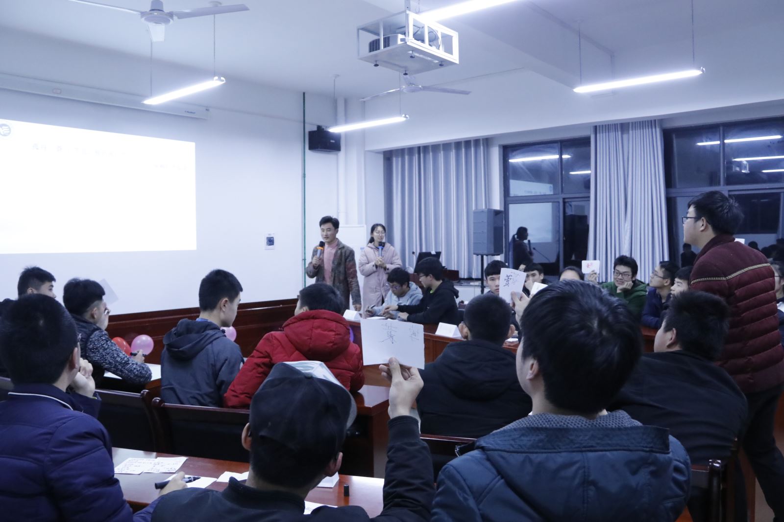 本次诗词竞答赛以“续读名家诗词,铭记中华精髓”为主题,分别由基础题、补白题以及抢答题三个环节组成。比赛共12支队伍参加,每两人为一组,比赛期间要求各组成员团结协作,合作答题。在以“春”、“雨”、“花”、“夜”为主题的基础答题过程中,选手们不甘示弱,一一对答如流,展露了不俗的实力。在随后的补白题环节中,出题者匠心独运将题目巧妙设计,将诗句挖去特定字词,要求每支队伍在规定时间内填空,并同时亮出题板。看似容易被答对的题目却让不少选手抓耳挠腮,逐渐将分数拉开。而在第三轮的抢答题环节中,主持人给出诗词的上下半句,选手在规定时间内其中,说出诗词的作者和朝代。抢答成功的选手若答错反而要扣分,使得不少原本得分领先的队伍在此环节遭遇滑铁卢,但是很多选手还是愿意放手一搏,过程的精彩早已让大家把比分抛之脑外,比赛达到高潮。此次比赛还巧妙穿插了与观众互动环节,所谓高手在民间,不少难倒一众选手的题目对观众来说却是信手拈来,现场掌声与欢呼不断,气氛十分欢乐。最后,经过激烈的角逐,来自材料1603班的选手扶祺祺、孙志平团队以微弱优势摘得桂冠。