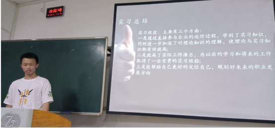 此次答辩包括PPT展示和提问两个环节。汇报现场,各位员工积极展示,“中国制造2025”、“滑动轴承的加工工艺流程”、“自动化产线”、“活塞设计要求与设计理念”等词汇频频出现在汇报中。提问环节,谢天池、曾文烨等同学就专业教师提出的关于实习收获、感受及专业认知等方面的问题进行回答。从他们的答辩可以感受到认识实习对员工专业认识、专业前景认知以及实践动手能力的锻炼有着积极而深远的影响,专业学习动力和专业认同感不断增强。