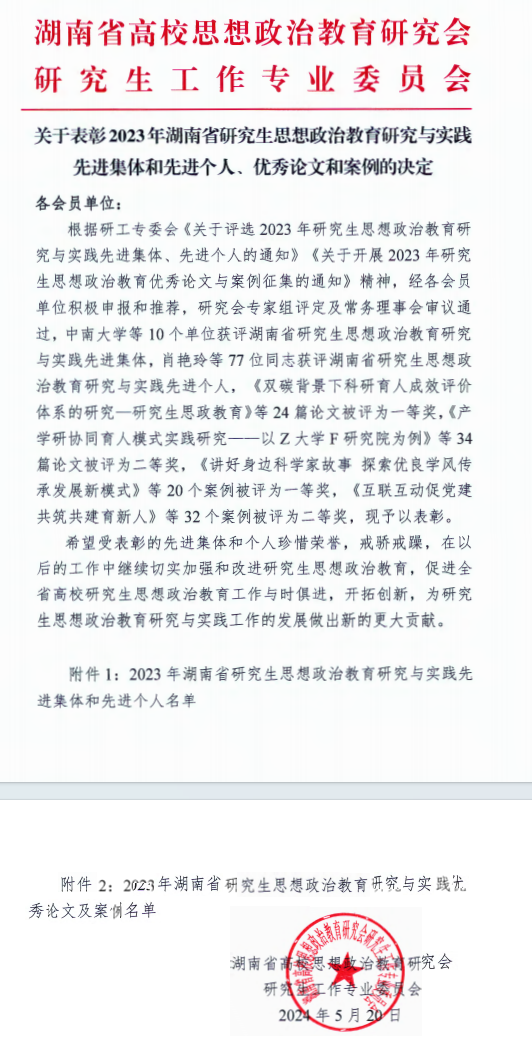 近日,湖南省思想政治教育研究会研究生工作专业委员会公布2023年湖南省研究生思想政治教育研究与实践先进集体和先进个人、优秀论文和案例,公司副经理邹鸿翔博士获评2023年湖南省研究生思想政治教育研究与实践先进个人。