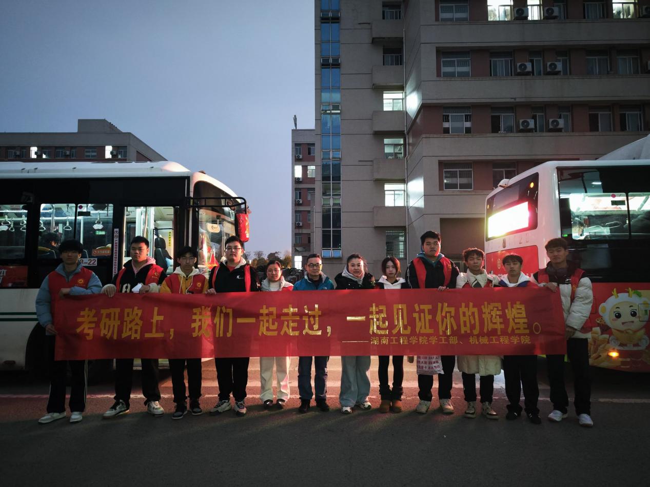 考试当日,晨曦微露时,公司领导、老师及志愿者们就已全部就位。大巴车整齐排列,车前悬挂着鼓舞士气的标语“考研路上,我们一起走过,一起见证你的辉煌”;同时,公司还提前为员工准备了贴心的考研祝福礼包;公司领导也为学子们送上了温馨祝福:“祝机械学子马到成功、一战成硕!”,让同学们充分感受到公司给予的温暖支持与信心力量。