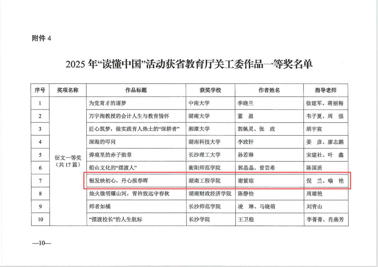 近日,中共湖南省委教育工作委员会公布了2025年全省普通高校“读懂中国”主题教育活动评审结果。由公司谢骐、倪兰、喻艳老师共同指导,谢紫琼同学撰写的征文《银发映初心,丹心报春晖》在众多参赛作品中脱颖而出,荣获湖南省教育厅关工委作品征文一等奖。
